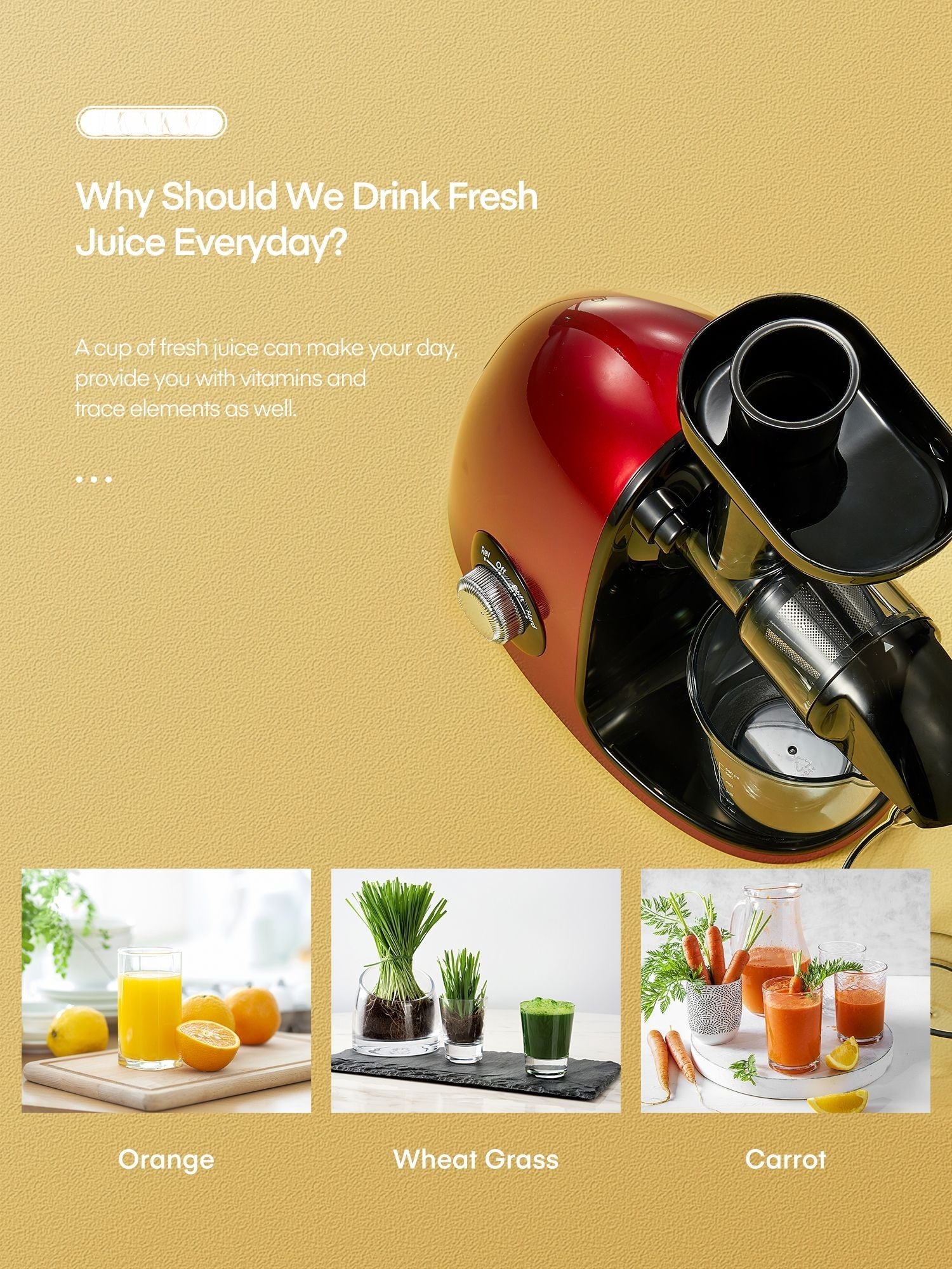 HIGHEST NUTRITIONAL VALUE - Rotate at a speed as slow as 80 RPM and chew through fruits and vegetables to yield more juice with less building up froth and heat. The enzymes and vitamins remain intact, juice becomes tasty and richer.