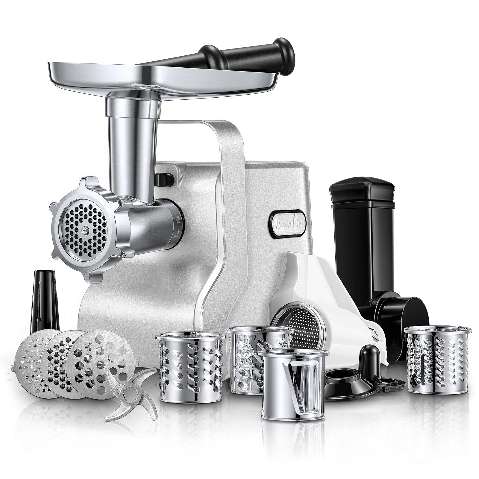 5 in 1 electric meat grinder with 3 Tempered Steel Grinding Plates (Fine, Medium, Coarse), Sausage Tubes and Kubbe Attachment. it can grind meat, beef and venison, chop vegetables, grate cheese and squeeze tomatoes, allowing you to easily make burgers, sausages, and various delicious food uses at home.