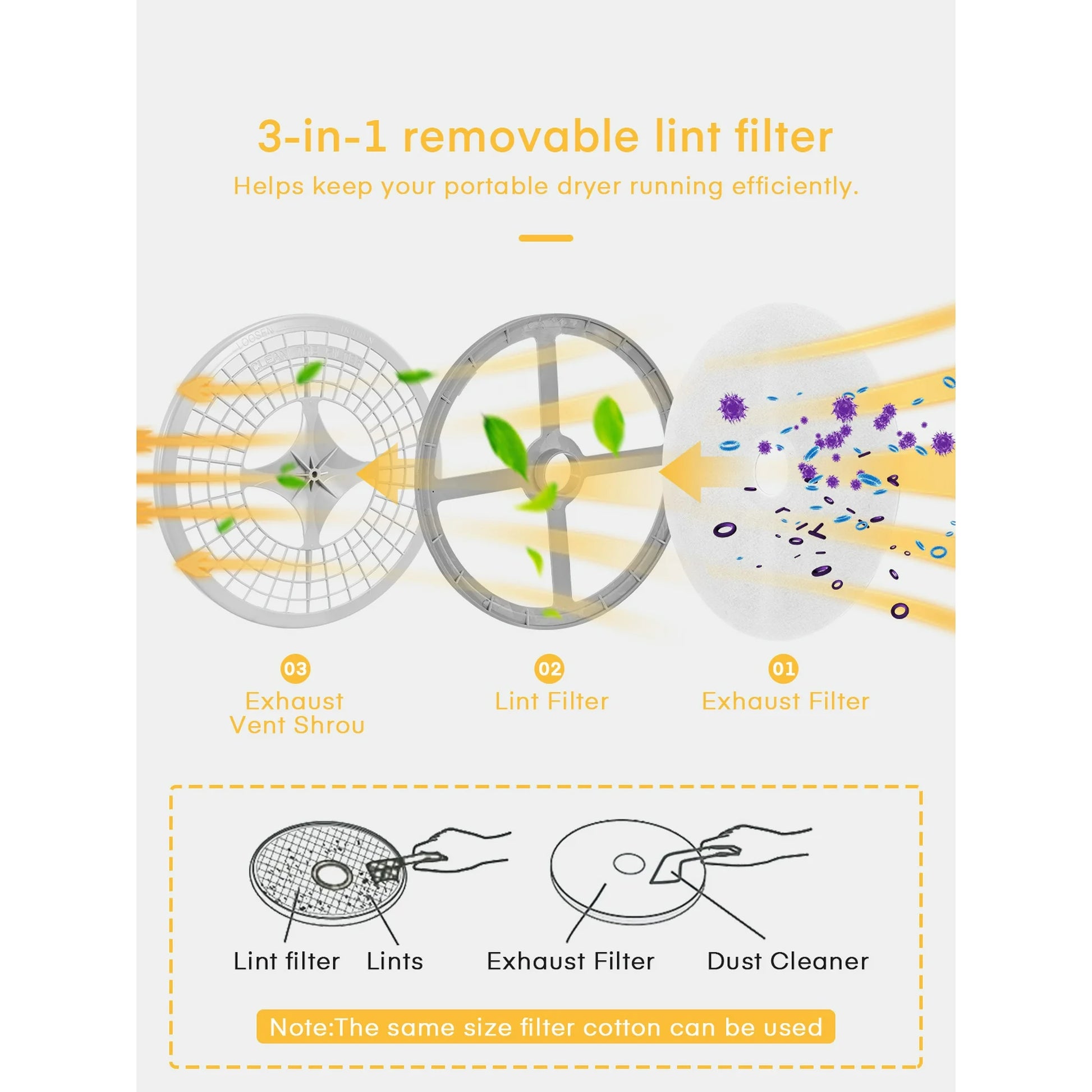 - 👕【Thoughtful Details, Convenient and Safe】-The transparent window allows you to understand the drying process at any time. Made of high-quality stainless steel inner drum and rust-proof outer shell, this dryer is durable and can stand the test of time. The three-in-one cotton filter can effectively remove odors and lint. If the door is opened while the machine is running, the machine will stop automatically. Equipped with overheating protection, it is safer.