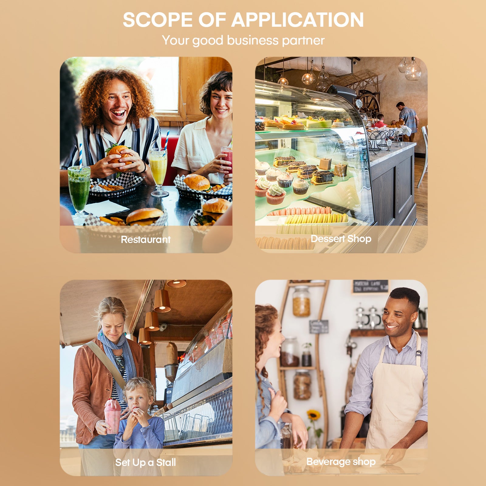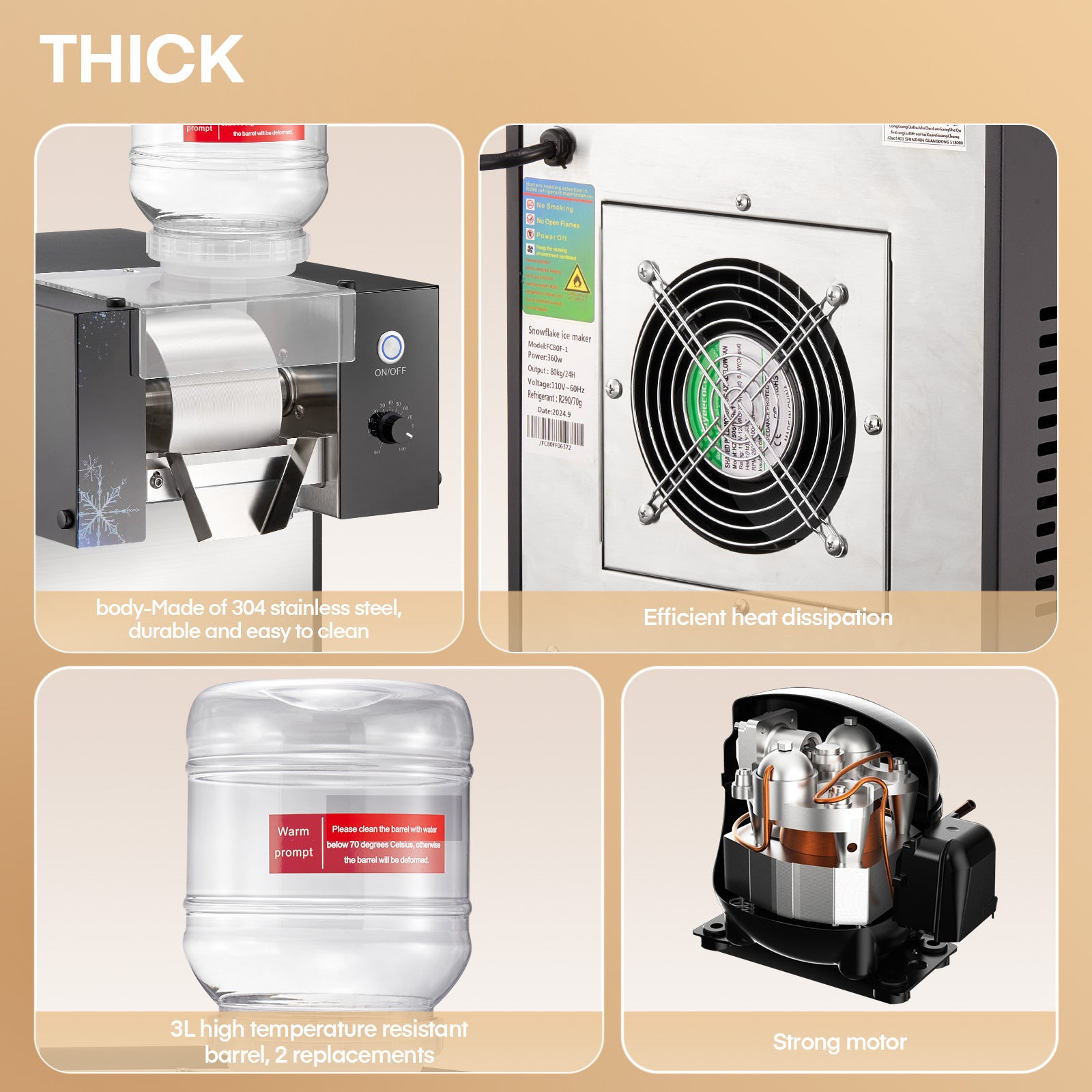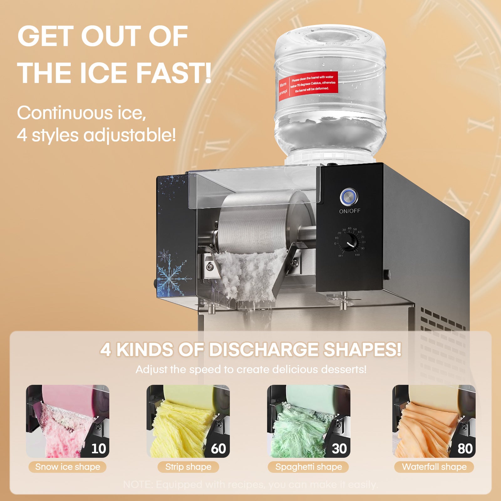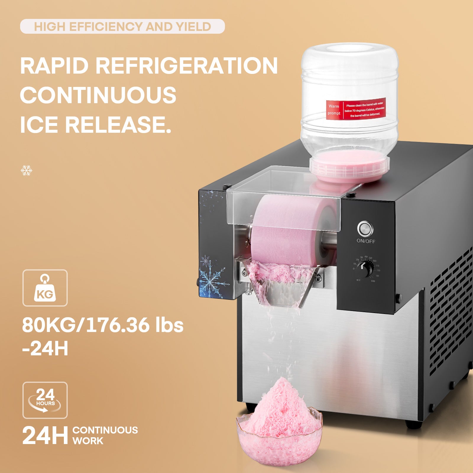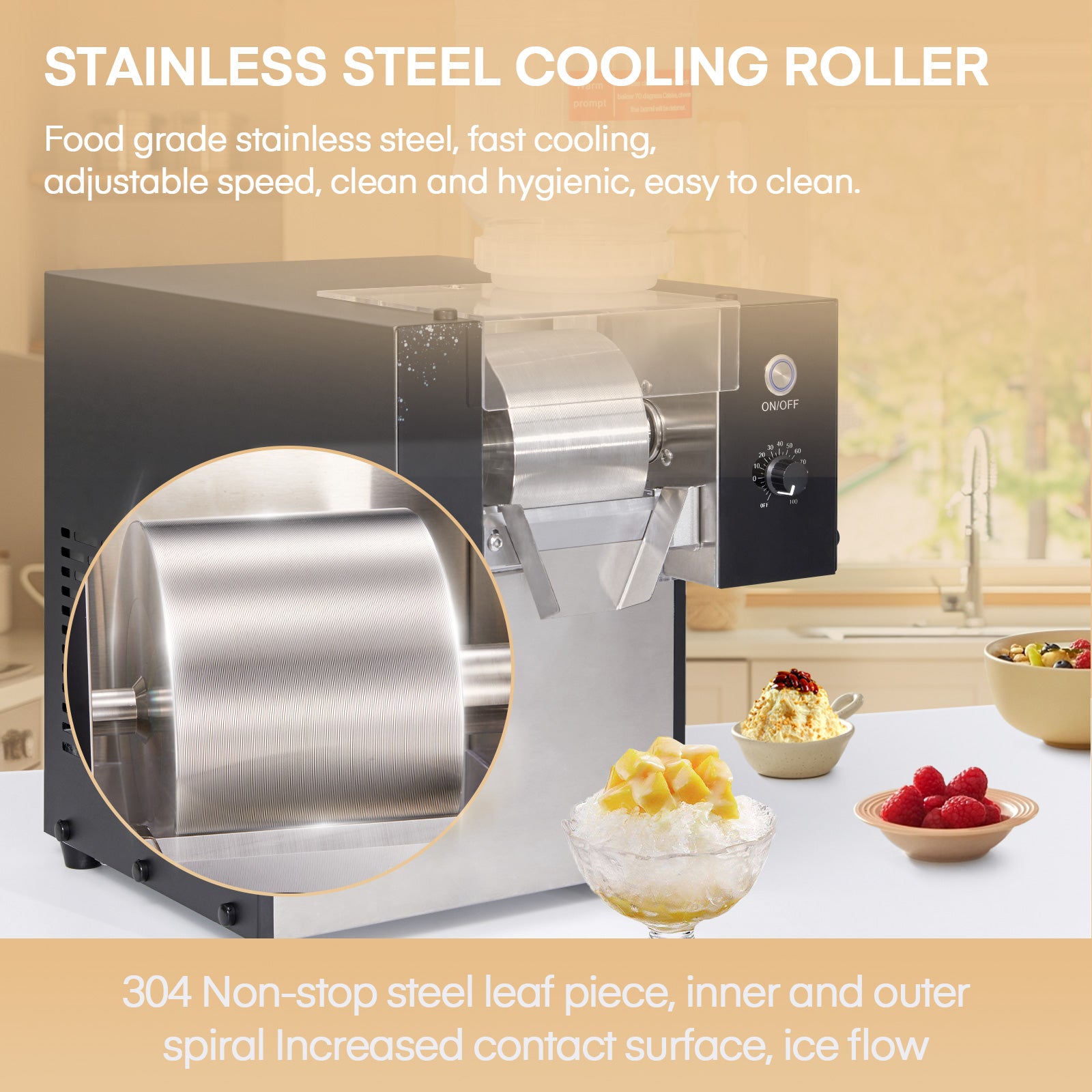 Experience the difference premium texture makes. The FOHERE Commercial Countertop Snowflake Ice Maker reliably produces high-volume, ultra-fine snowflake ice – the essential foundation for exceptional cold beverages and desserts.Easily adjust the roller speed to achieve variations from fine, snow-like powder ideal for traditional shaved ice treats. With a dependable output of approximately 80 kg (176 lbs) of ice per 24 hours, supported by an efficient compressor and air cooling system, this countertop unit is designed to keep pace with service demands. Its compact footprint (46x40x32cm / 18.11"x15.75"x12.60") makes it a must have to any bar counter, dessert station, or cafe prep area.