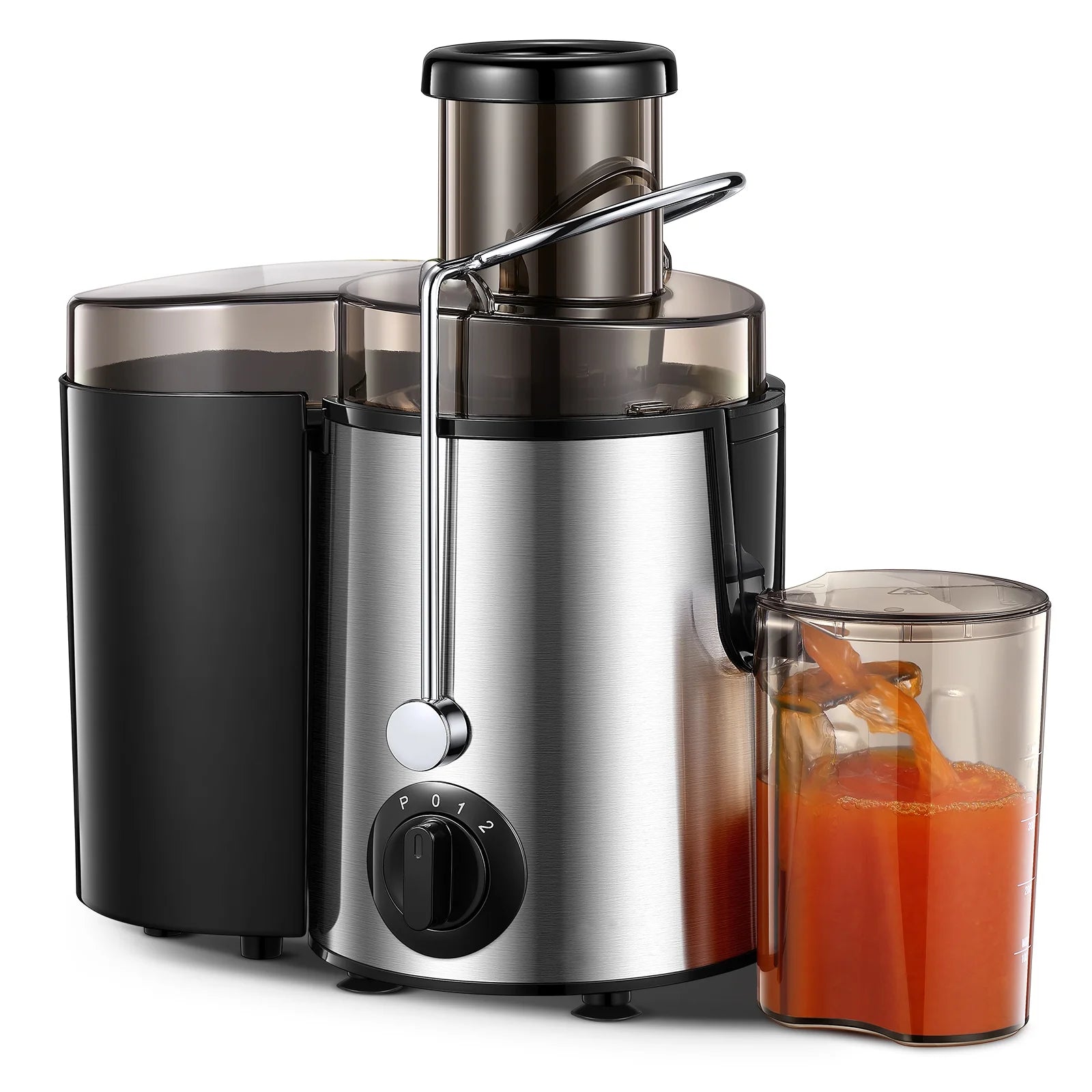 【3 Speed Control】With 3-speed models. "1" low speed is for soft fruits like peeled oranges, cucumber or kiwi, etc.; "2" high speed is for hard fruits like carrot, celery, apple, kale, etc. Choosing the right speed model on the juice machine helps to increase the juice rate. It also has a "Pluse" speed function to avoid stuck and helps you clean.