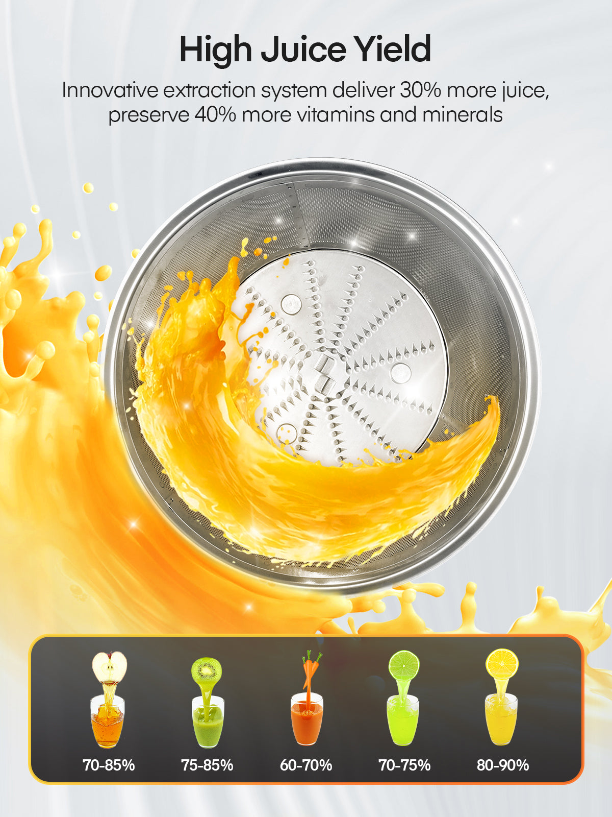 - 【Dual Speed Control】The juicer features two speeds to suit different fruits and veggies, giving you full control over soft and dense ingredients. Use the low speed for softer fruits and leafy vegetables, and the high speed for denser fruits and harder vegetables. Choosing the appropriate speed for each type of food can enhance the juice yield and flavor.