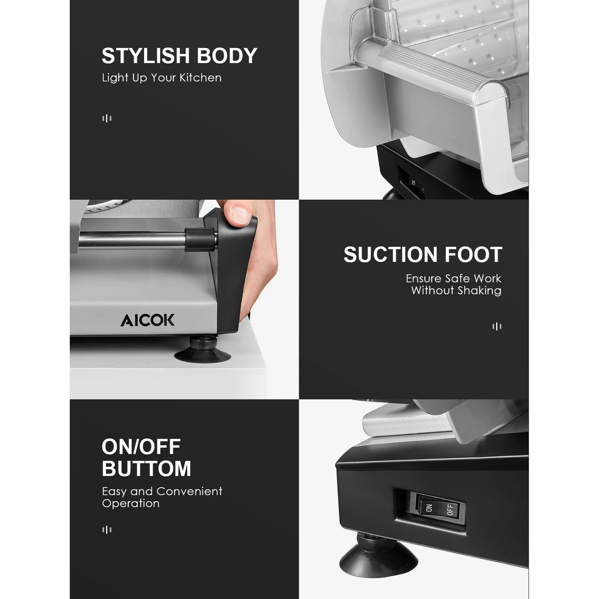 - 【SAFETY PROTECTION】 Non-slip suction feet ensure this deli food slicer stay in place stably while you are operating. Food pusher also acts as a blade guard to help keep your fingers safe. Inner ON/OFF switch offers even more safety insurance. So you can use this slicer machine at home with confidence. (Blades run slower for better cutting results and better machine protection for longer machine life).