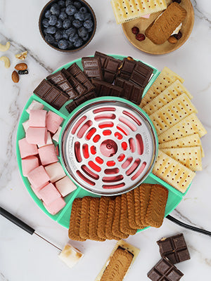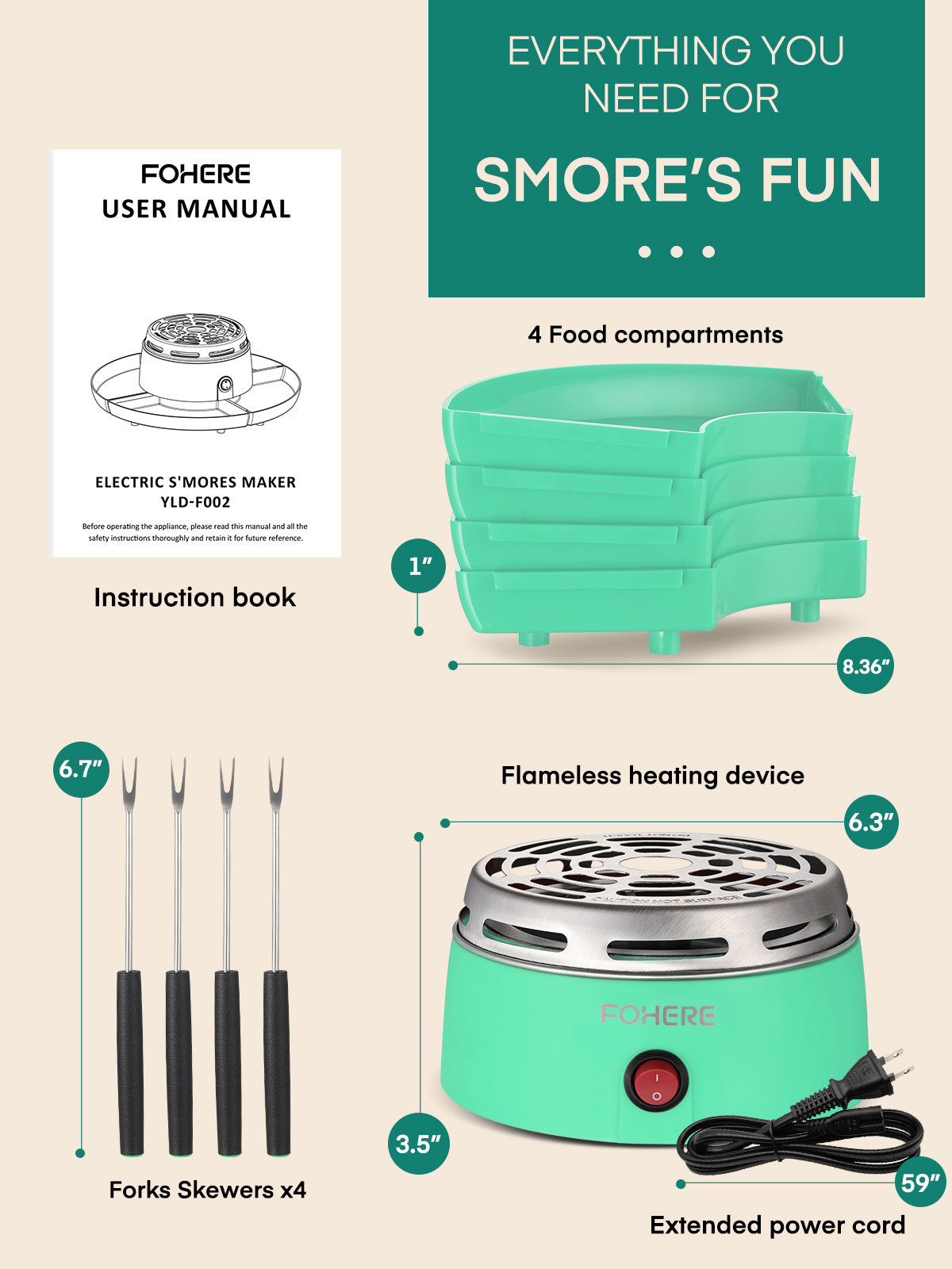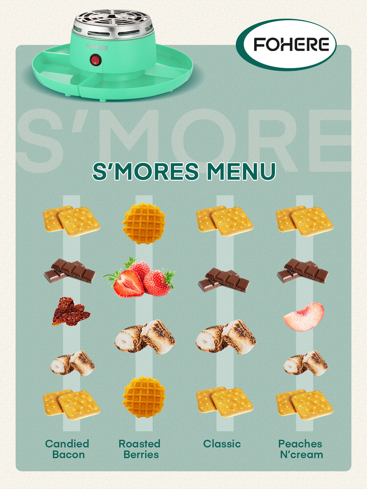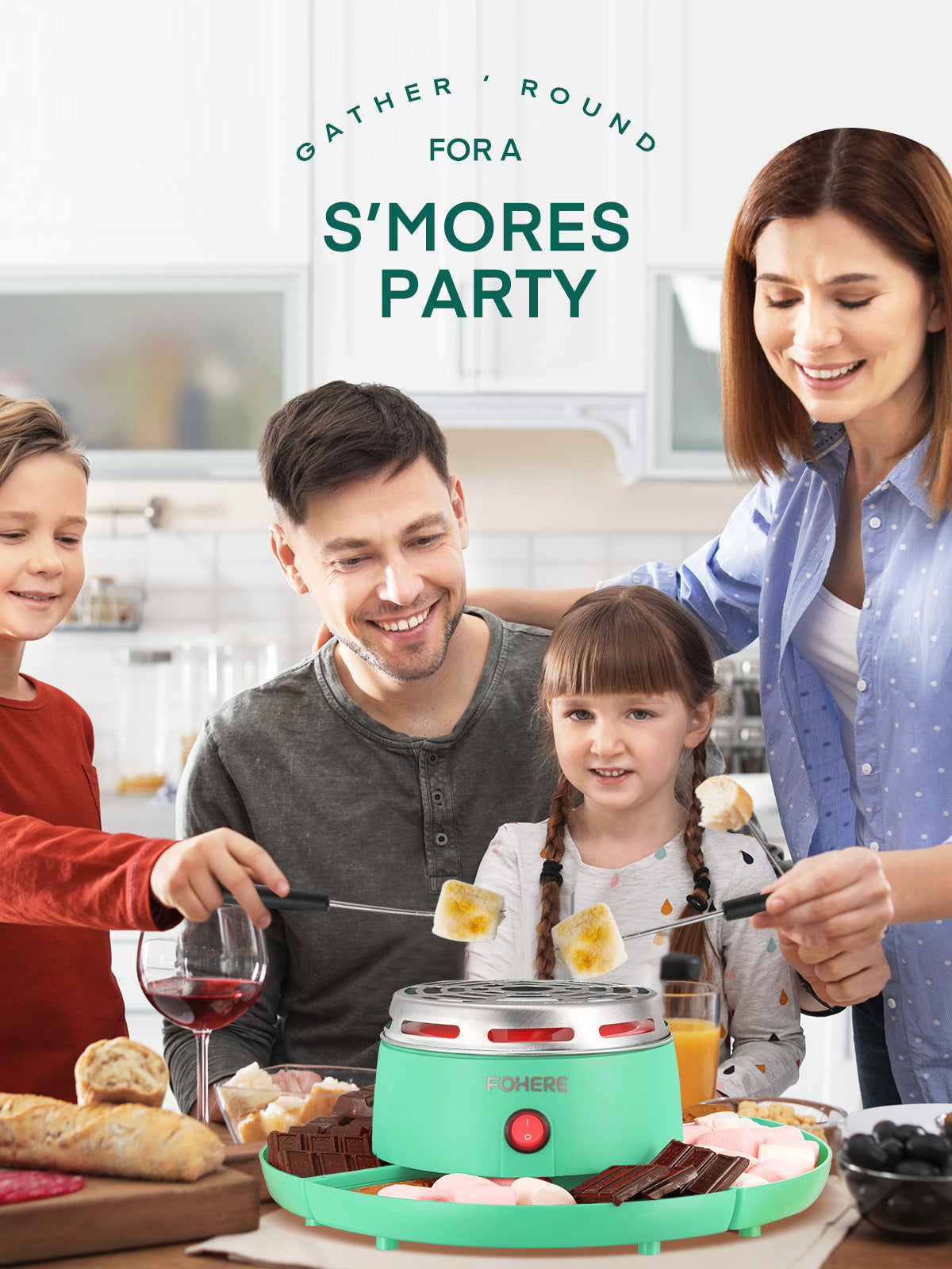 - 2 IN 1 ELECTRIC S’MORES MAKER & CHOCOLATE FONDUE POT:The 2-in-1 s’mores kit includes 1 flameless heater with adjustable temperature, 4 detachable food trays, 4 baking forks. Not only does the tabletop smores maker make a smoker, it also melts chocolate. Great for dipping fruit, pretzels, marshmallows, candies and more!