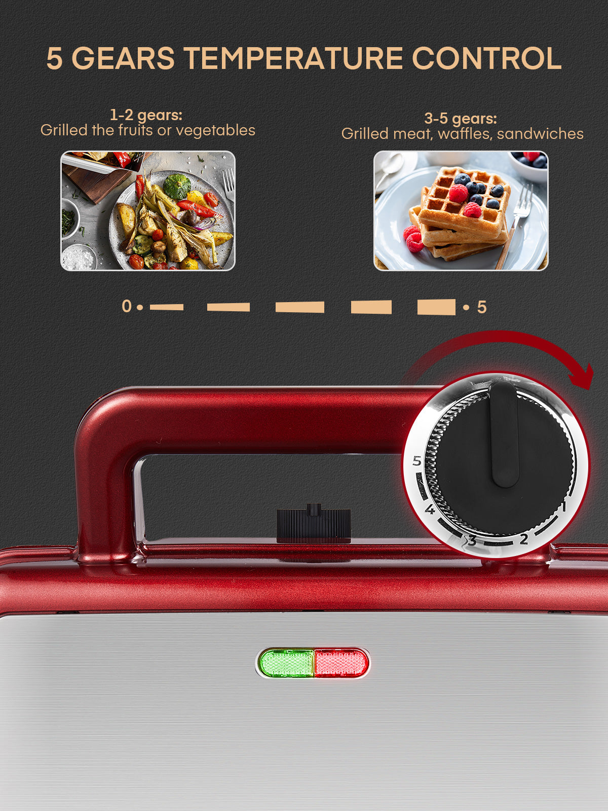 - Safe & Easy to Use - The waffle-iron housing made of heat-resistant stainless steel, the non-slip feet and the insulated handles ensure safe operation without the risk of burns. LED indicator (red light is always on, preheating or heating is completed, green light is off).