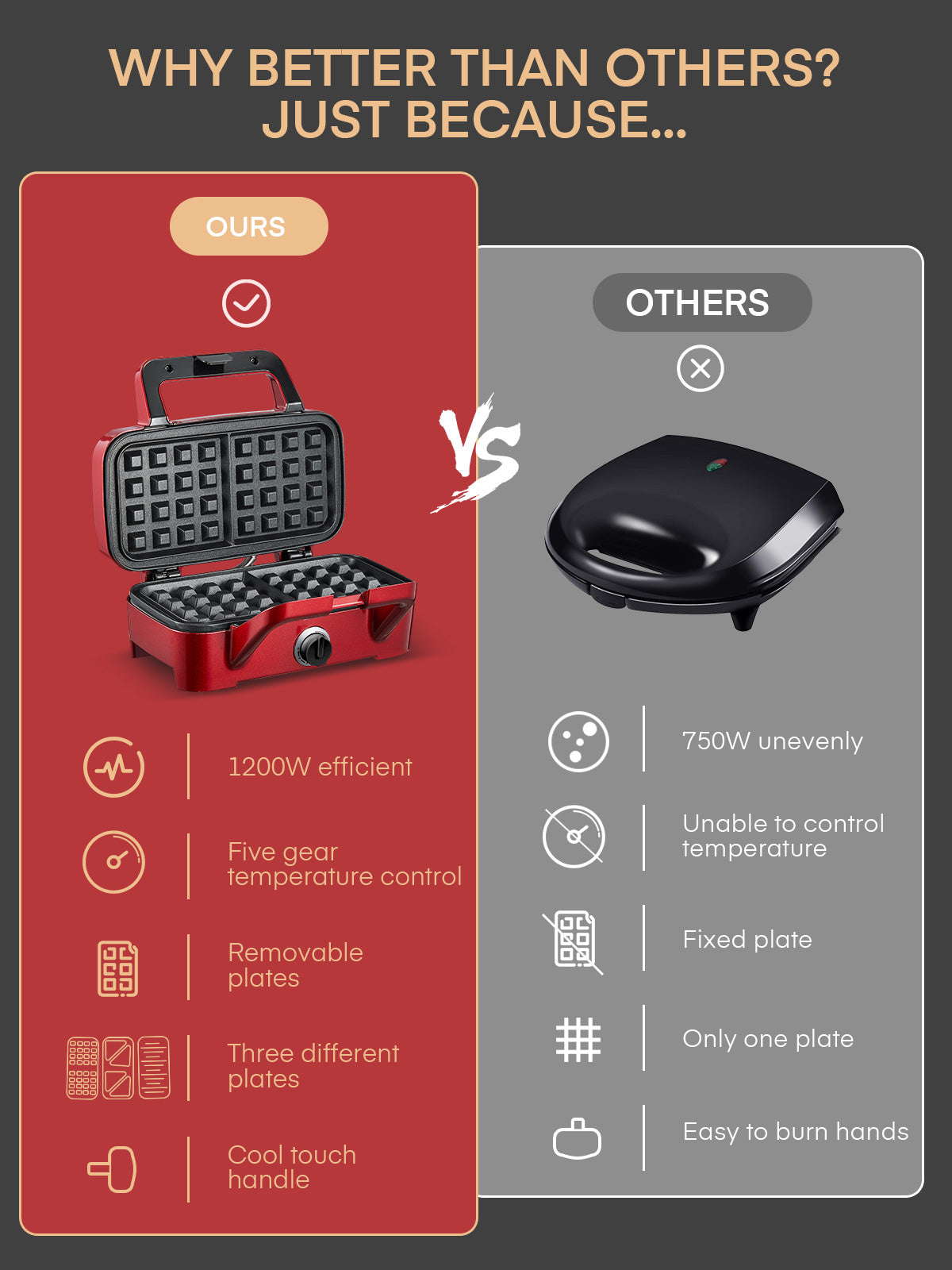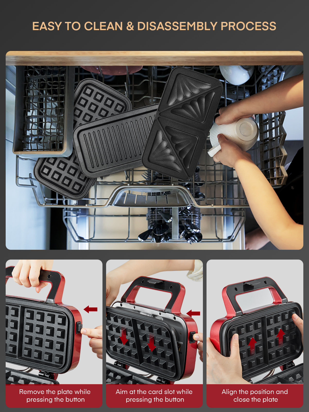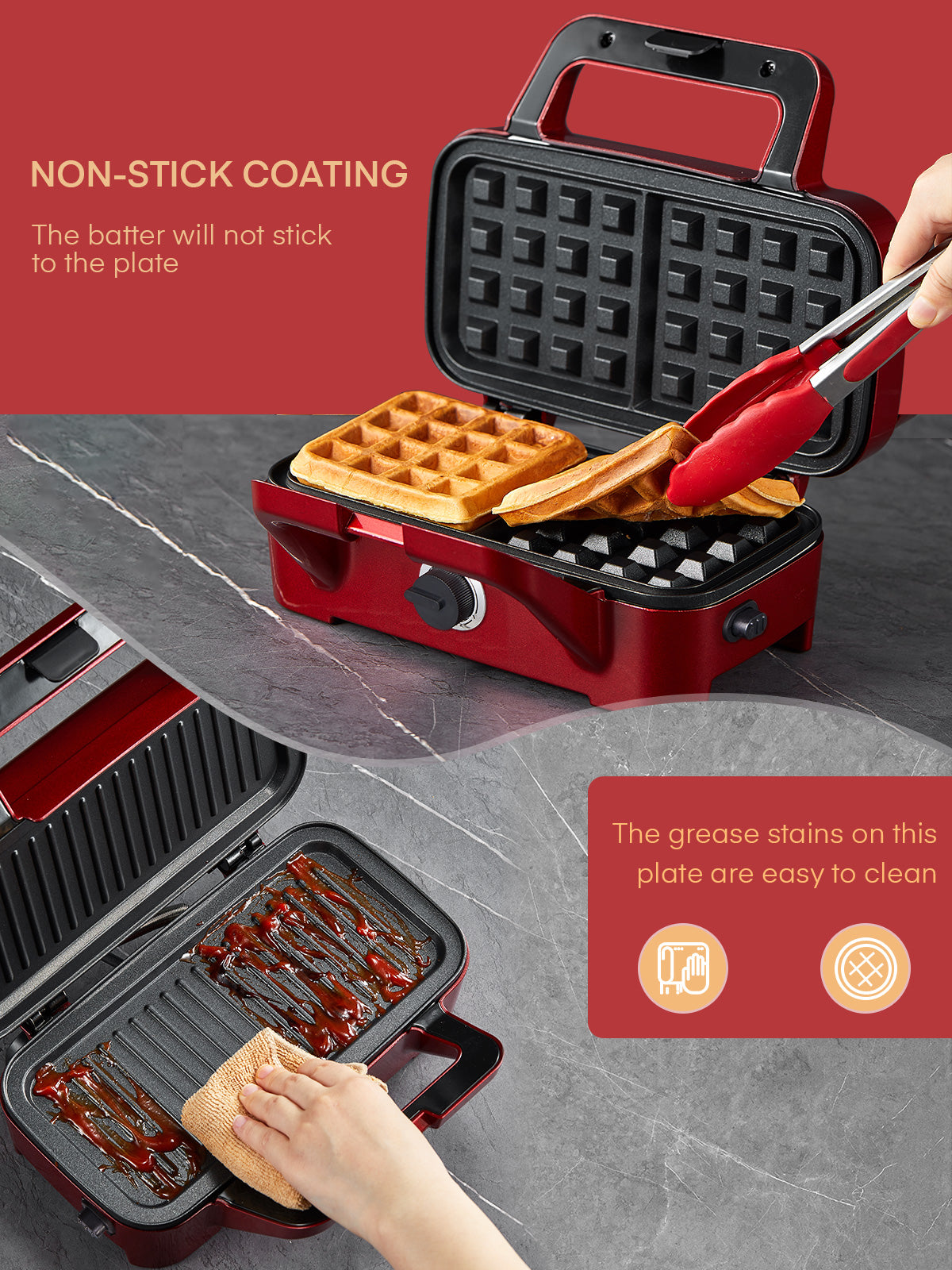 3 in 1 Waffle Maker - Offers 3 removable grill plates (sandwich, waffle and grill plates). Perfect for classic sandwiches, crispy waffles, juicy steak, slightly burnt vegetables etc. In addition, these three detachable plates are teflon coated, high-quality non-stick coating, water and oil repellent, easy to clean.